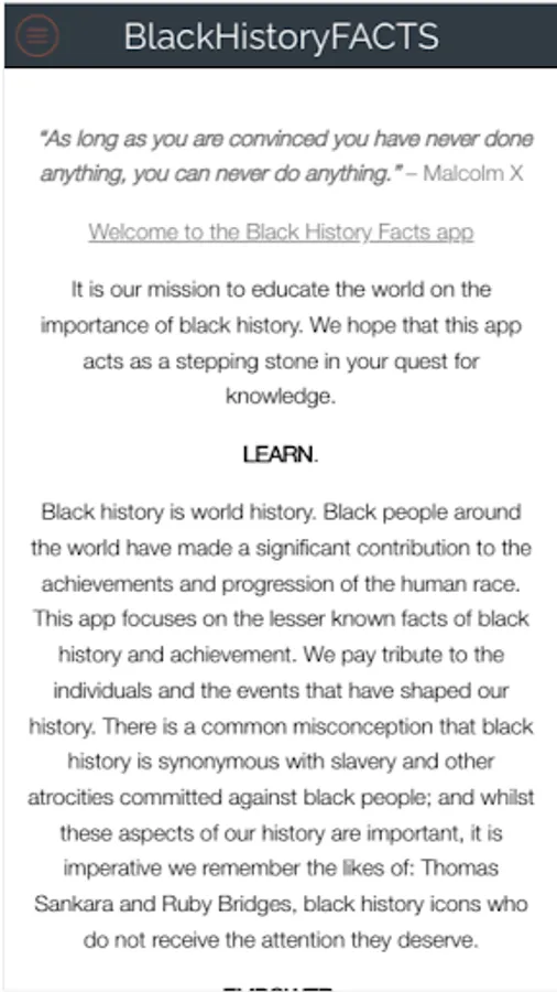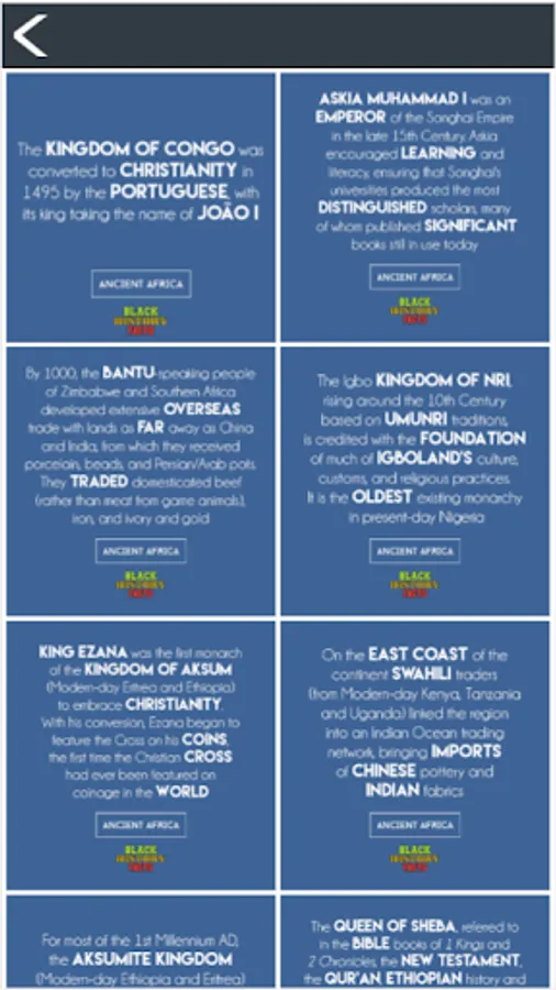 The Black History Facts app is a collection of over 500 facts across 11 categories of black history. We have searched far and wide to bring you facts ranging across: Ancient Africa, Pre-colonial Africa, Colonial Africa, Modern Africa, African-American, Black British, Caribbean History, Black Women, Black Achievement, The African Continent and The Caribbean Islands. You may be surprised by what you find out!