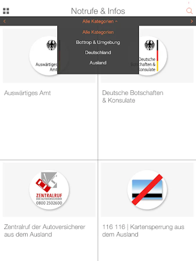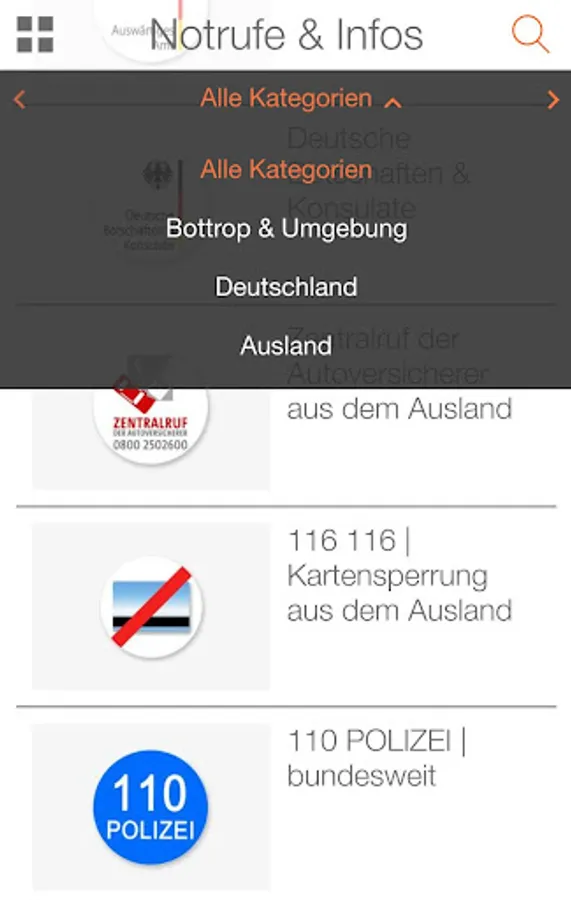 The directory EMERGENCY SERVICES & INFOS is helpful when things have to go quickly. Whether in Bottrop, in the surrounding area, in Germany or in distant countries - here you will find emergency numbers with direct call function, medical emergency services, pharmacy emergency services, poison emergency centers, direct contact for blocking SIM, EC or credit cards, traffic jam information, information to over 150 German embassies & consulates abroad and much more