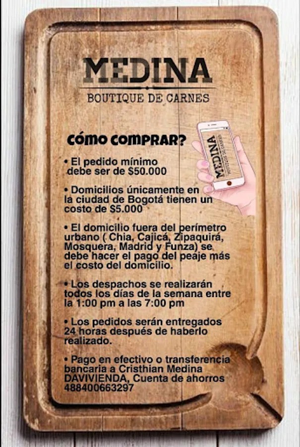 10. Similarly, if you have any questions, you can always contact our service lines. Whatsapp 3132368503 between 8 am and 8pm .. instagram..medinaboutiquecarnes