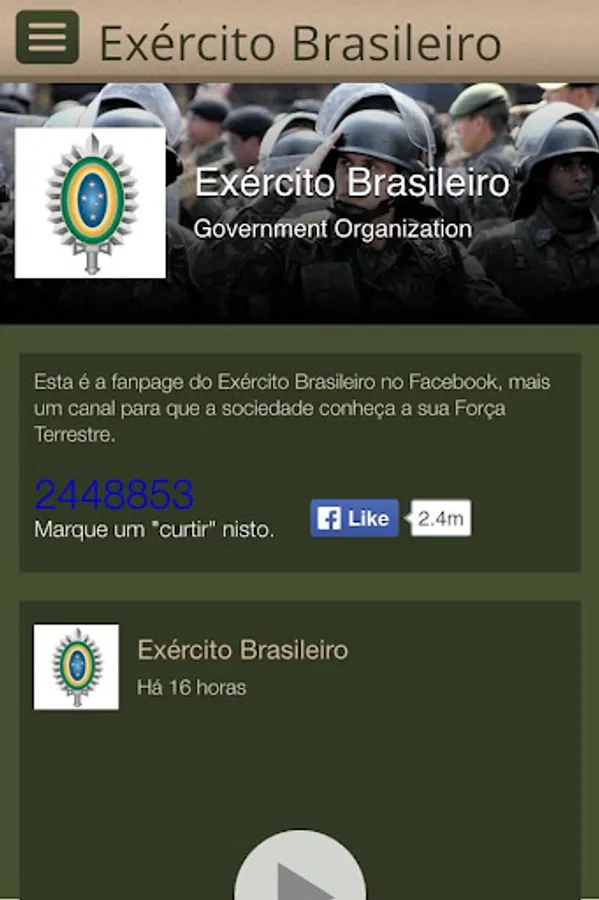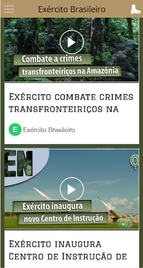 Official application of the Brazilian Army, now content in RSS format, and links to key services. In this version, the following contents are available: Facebook, Youtube, Twitter, Instagram, eBlog, Magazine VO, Army News, Review, EB in Review, INFORMEX, Army Report, Paycheck, Health, DGP and Recrutinha.