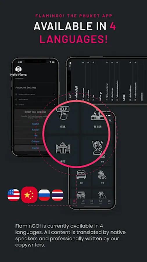 The FlaminGO! App is available in English, Chinese, Russian and Thai, so everyone who is visiting, or making holidays in Phuket, can be sure to understand the travel guide at their own terms.