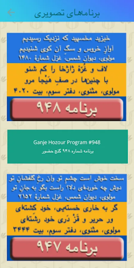 The Mobile App Version of parvizshahbazi.com which contains Interpretations of Rumi's poems in Farsi and English under Ganj e Hozour (Treasure of Presence). Please check out our website for our newest Ganj e Hozour programs.