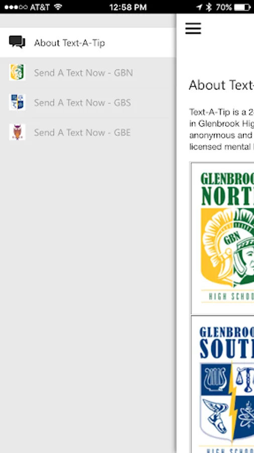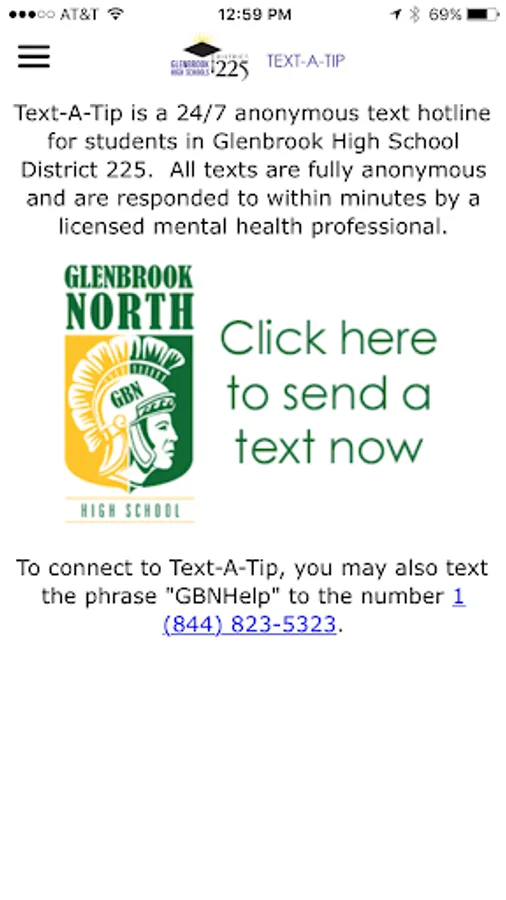 Mobile app supporting LEAD's Text-A-Tip system for Glenbrook High Schools (Glenbrook North, Glenbrook South and Glenbrook Evening High Schools). Text-A-Tip is 24/7 anonymous text line intended for use by students. All texts are fully anonymous and are responded to within minutes by a team of licensed mental health professionals.