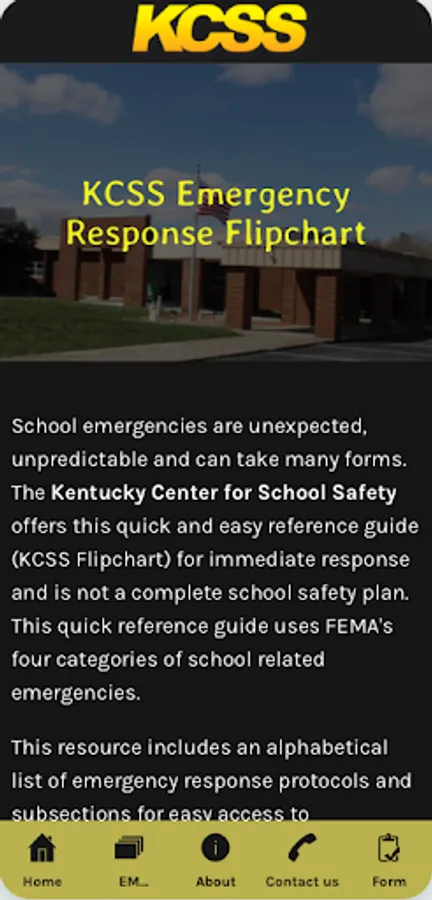 The Kentucky Center for School Safety provides this KCSS Emergency Procedures Flipchart acknowledging that now more than ever before, schools are faced with ongoing challenges. They must be prepared for a wide-range of emergency situations from natural disasters to threats of violence. School emergencies are unexpected, unpredictable, and can take many forms.