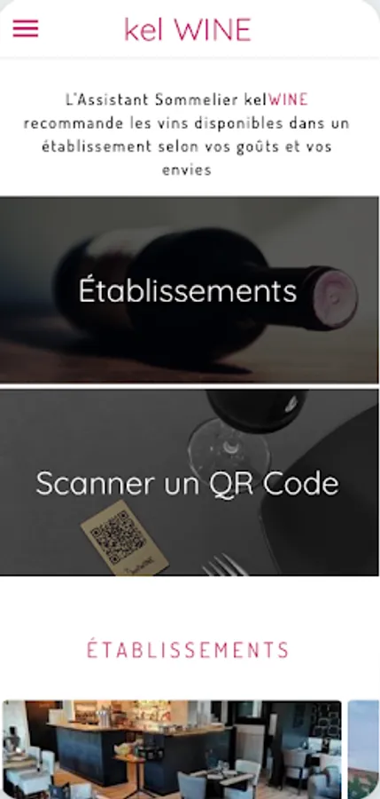 Discover Kelwine, the revolutionary application designed especially for wine lovers and novices in search of the perfect nectar. Thanks to our innovative technology based on QR codes, Kelwine offers you a unique experience in selecting wines adapted to your desires.