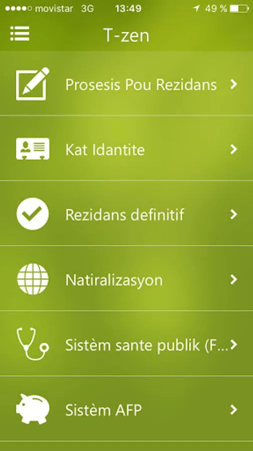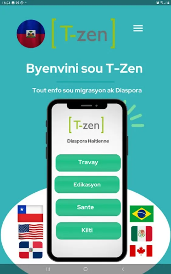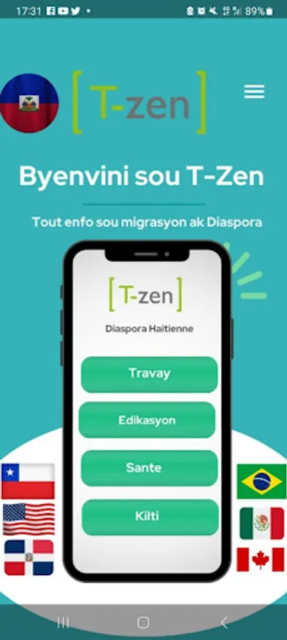 Sou platfòm T-Zen an w ap jwenn tou enfòmasyon sou vwayaj ki ede ayisyen migrate, refijye, etidyan ak touris nan Chili, Etazini, Kanada Meksik, Brezil, Sen Domeng…”. Enfòmasyon sou viza, travay, transpò, lekòl, sante, biznis.