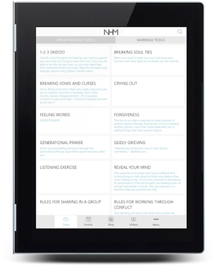 • NHM Tools: We’ve compiled all the tools from Love After Marriage and Single Life Workshop for quick reference and easy use. Regularly practicing these tools is one of the best ways to develop your confidence to overcome the obstacles that come against you, your relationships and/or your marriage.