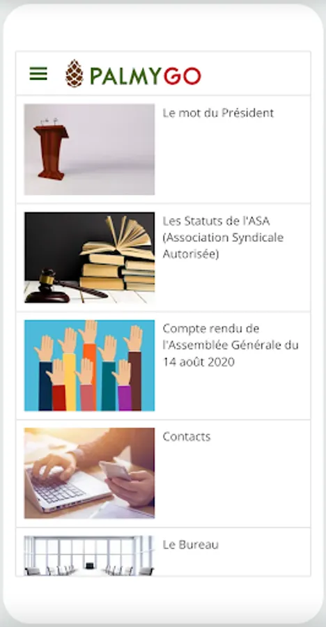 Palmygo is an informative tool at the service of the Residence de La Palmyre, this application allows you to know everything about the different activities offered to residents (entertainment, sports, parties, meetings) but also to be informed about the life of the Association of Owners: management and maintenance of the Park, office work ... There is also practical information for everyday life and knowing how to live together.