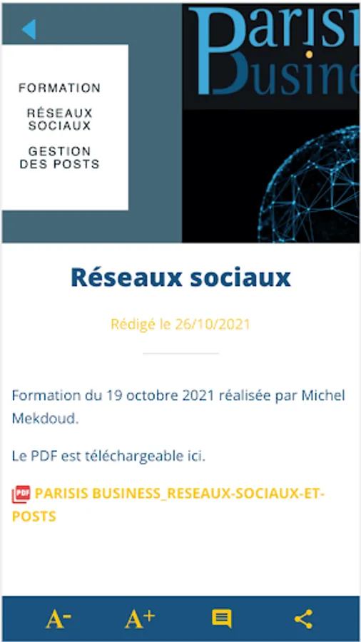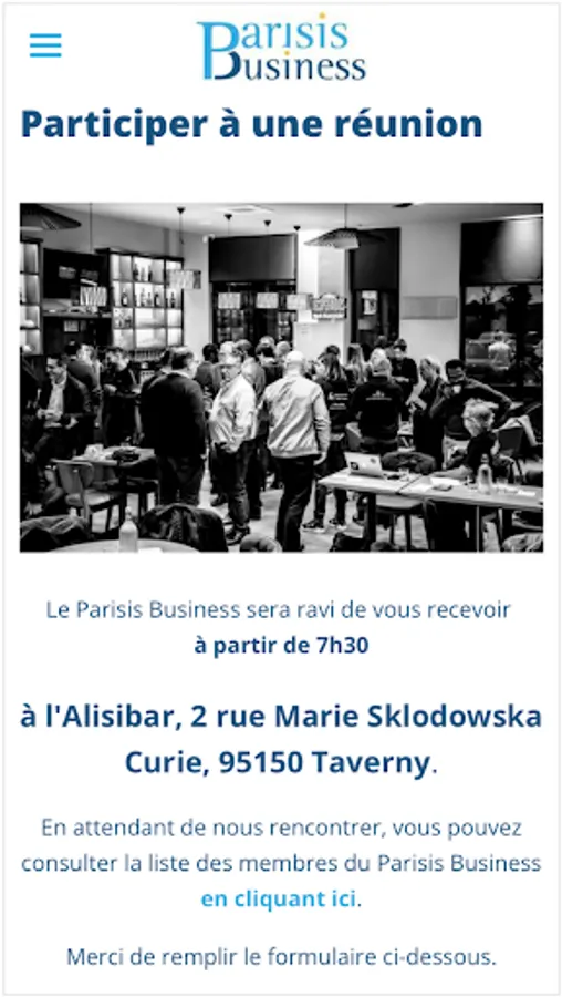 You will find there: • the Parisis Business agenda • access a form to take part in a meeting • information disseminated on the association's social networks (Facebook, Instagram, Linkedin, Youtube, etc.) • information on members of the association • photo reports of events