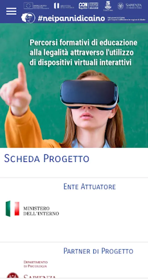 The PON Project "In Cain's shoes to understand and defend Abel's reasons (Education in legality for the prevention of antisocial behavior also expressed through the use of immersive virtual reality)" sees the collaboration of the Ministry of the Interior - Department of Public Security – Central Directorate for the Road, Railway, Communications Police and for the Special Departments of the State Police and the Psychology Department of the Sapienza University of Rome.