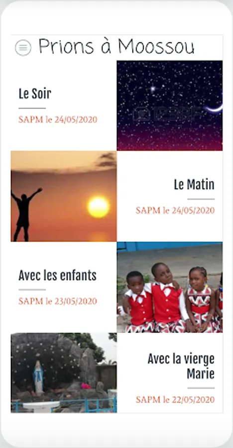 Pray to Moossou allows the word of God to remain grounded in the real world. Images, comments, reading keys, recordings of the gospel of the day and prayers, aids for biblical sharing, scores and recordings of liturgical songs, openness to life in the world and in the 'Church contribute to its purpose.