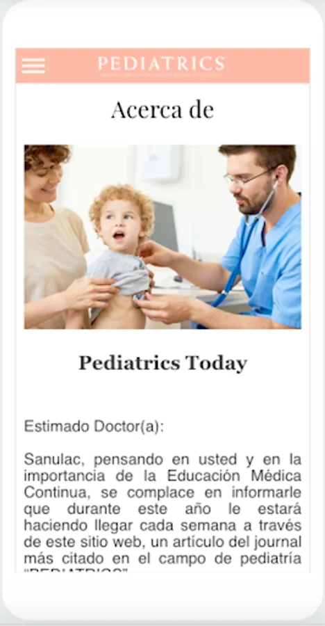 Sanulac, thinking of you and the importance of Continuing Medical Education, is pleased to inform you that during this year he will be sending you every week through this APP, an article from the most cited journal in the field of pediatrics "PEDIATRICS".