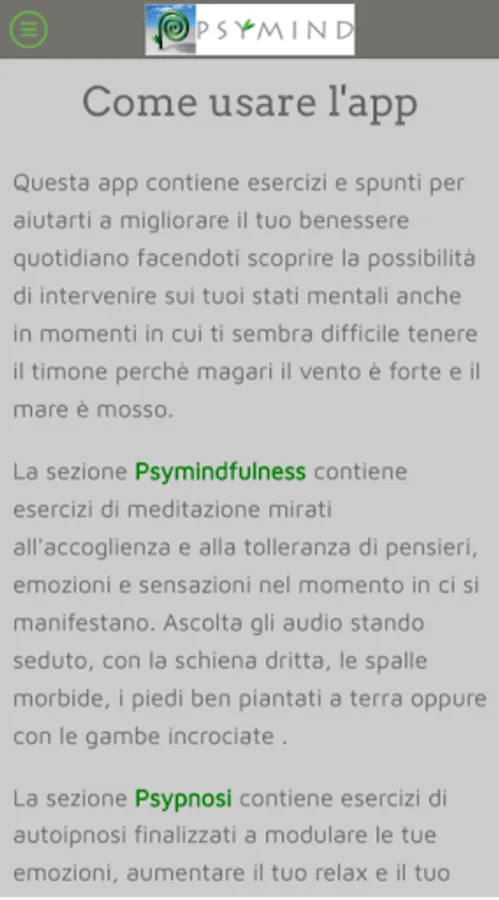 La sezione Psymindfulness contiene esercizi di meditazione mirati all'accoglienza e alla tolleranza di pensieri, emozioni e sensazioni nel momento in ci si manifestano. Ascolta gli audio stando seduto, con la schiena dritta, le spalle morbide, i piedi ben piantati a terra oppure con le gambe incrociate .
