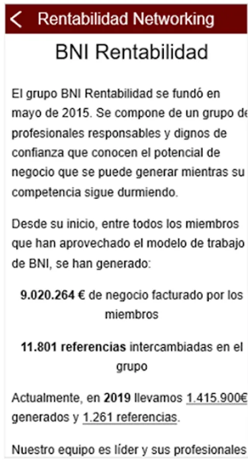 Rentabilidad Alcalá is the official App of the BNI Rentabilidad group of Alcalá de Henares. It was founded in May 2015 and consists of a group of responsible and trustworthy professionals who know the business potential that can be generated while their competition continues to sleep.