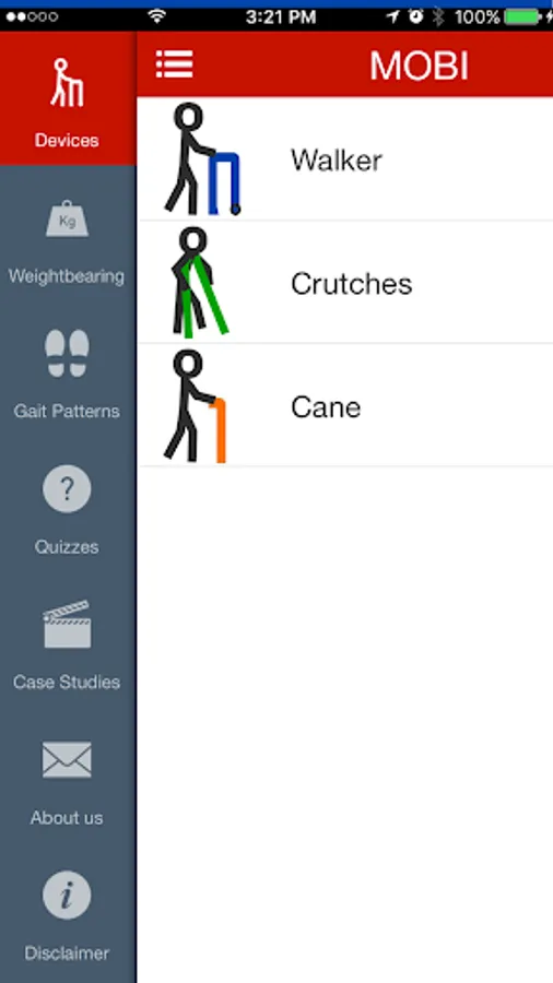 MOBI provides an innovative way to learn about ambulatory assistive devices. MOBI uses high-definition videos and images as well as quizzes and video case studies of real patients using walkers, crutches, and canes. MOBI includes information on weightbearing, gait patterns, device selection, sizing, stairs, precautions, and guarding techniques.