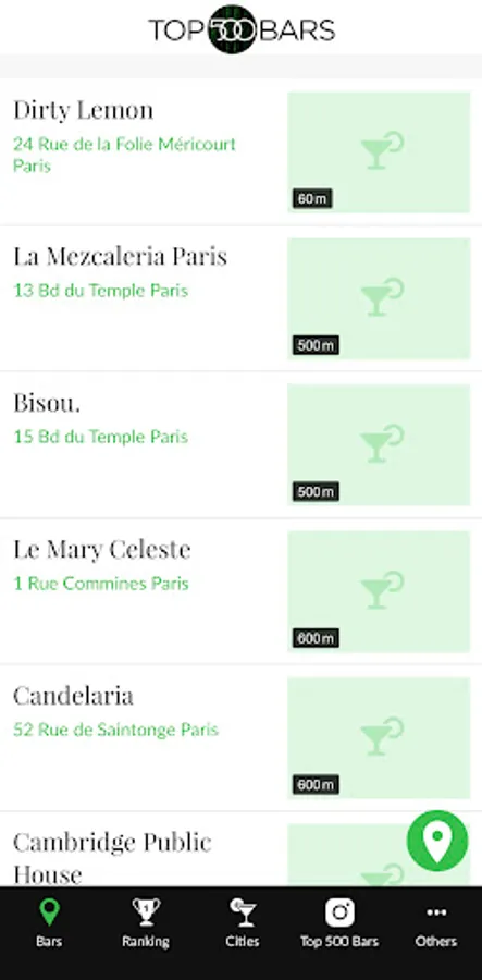 Top 500 is an app dedicated to the global ranking Top 500 Bars. It means the app finds the closest cocktails bar, hotels bar, restaurants bar which are part of the Top 500 ranking all around the world, in a few seconds, wherever you are. Thanks to the localization you'll be able to see all the Top 500 Bars around you on a map or the distance to the closest one via another type of view.