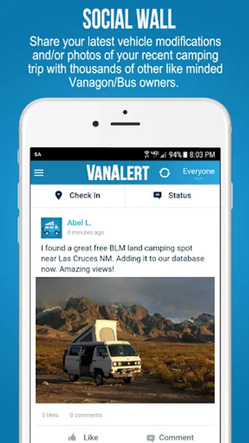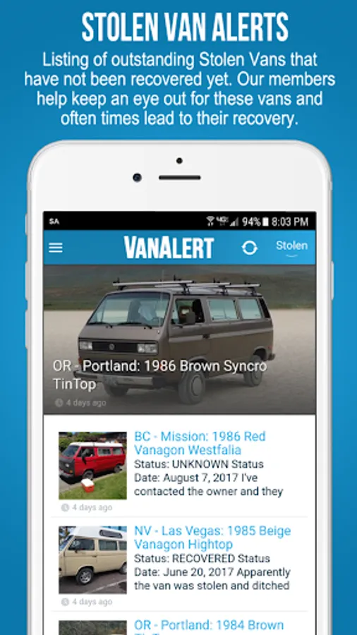 The main purpose of this app is to help recover stolen Vanagons. We have a REPORT STOLEN VAN feature which in case your van is stolen, you fill out the form with your vehicle's information and a photo. Once we receive it we put out a PUSH NOTIFICATION to all VanAlert users/Vanagon owners. This helps get the community involved in helping locate your Van, they'll be notified with all of the information you provided.