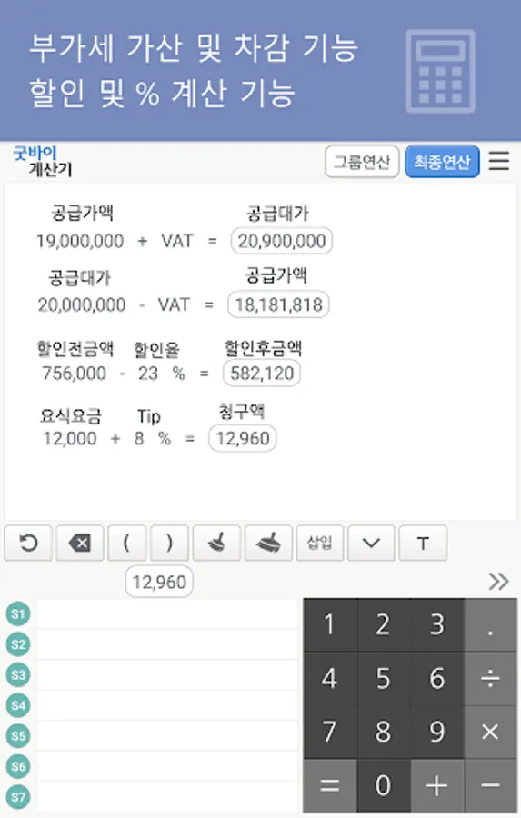 ▶ 공급가액에 부가세 가산 기능 및 총 금액에서 부가세 차감하여 공급가액 산출 기능 및 %계산 기능