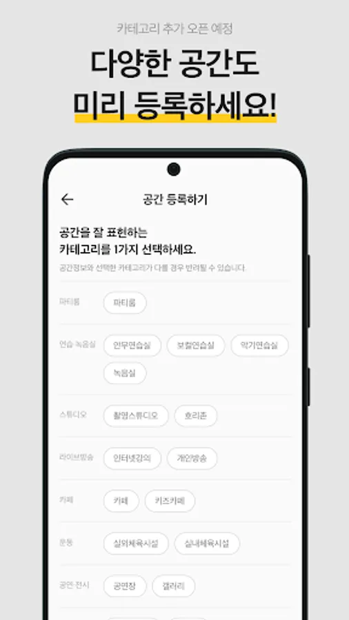 - You can register various space categories such as party room, practice room, studio, cafe, exercise, performance hall, and study room.