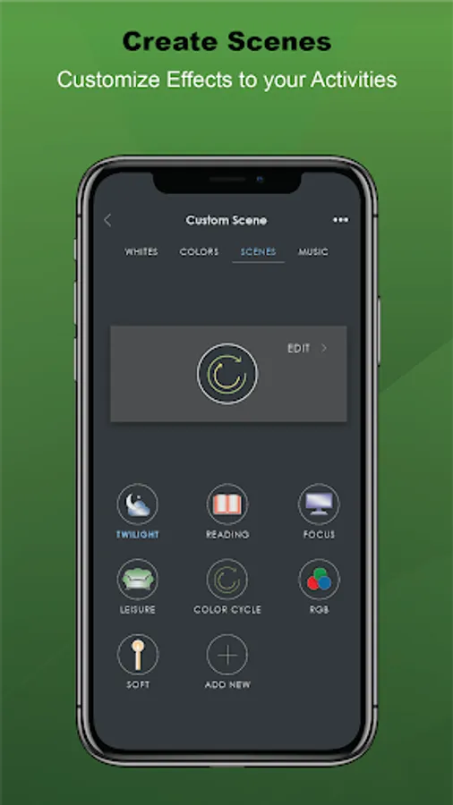Create Scenes Create unique scenes with customizable effects, color cycles, brightness, and speed.