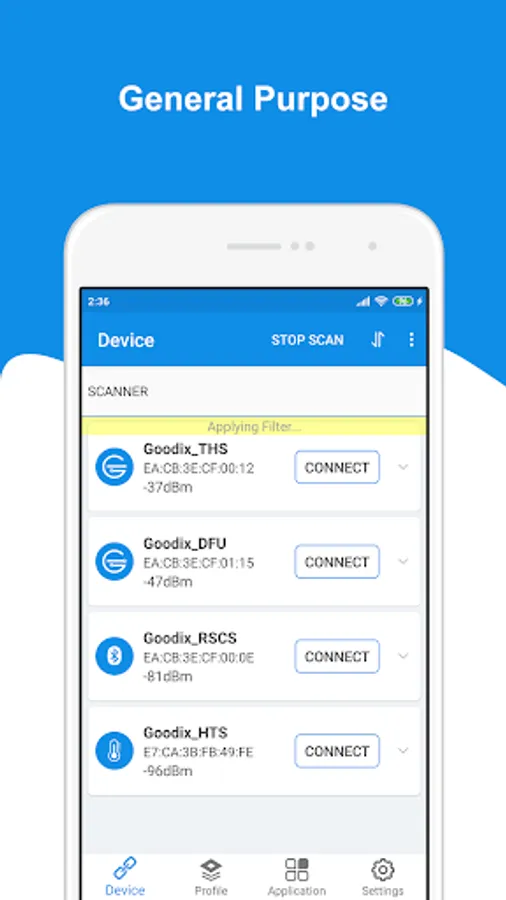 • Scanning devices (with filter and can list devices with signal strength from the highest to the lowest)