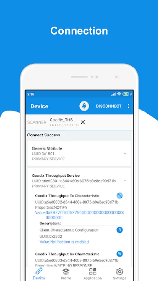 GRToolbox is a mobile APP that can scan Bluetooth LE devices, demonstrate standard profile applications, and jointly debug Profile/Service functions related to Goodix Bluetooth LE platforms, to help users quickly get started with secondary development and debug applications based on Goodix Bluetooth LE SoCs.