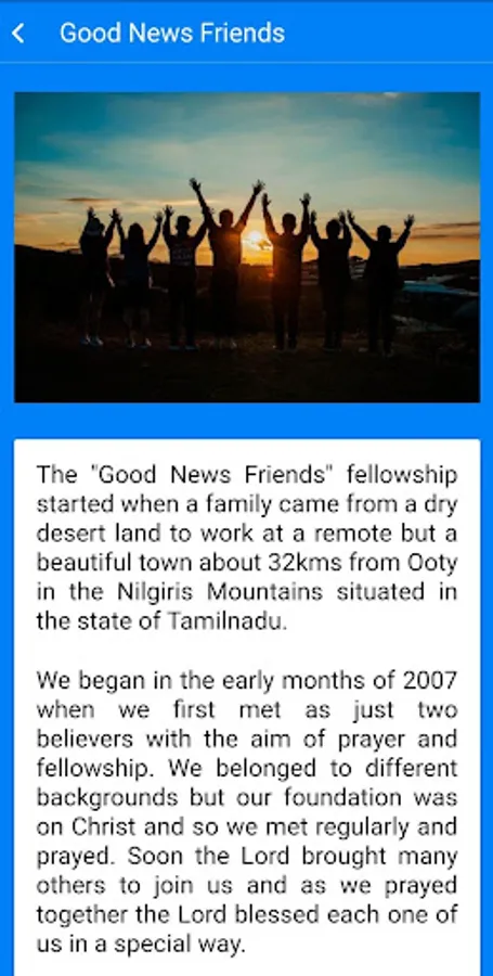 The "Good News Friends" fellowship started when a family came from a dry desert land to work at a remote but a beautiful town about 32kms from Ooty in the Nilgiris Mountains situated in the state of Tamilnadu.