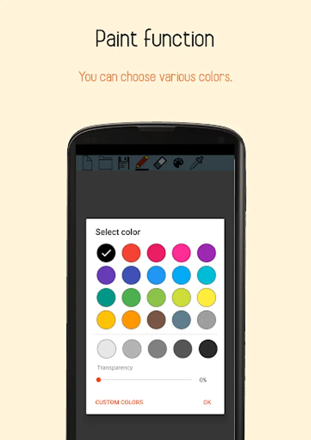 *Coloring : Supporting default colors and Custom colors, able to change background color. And transparancy can be set.