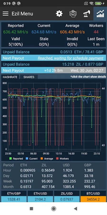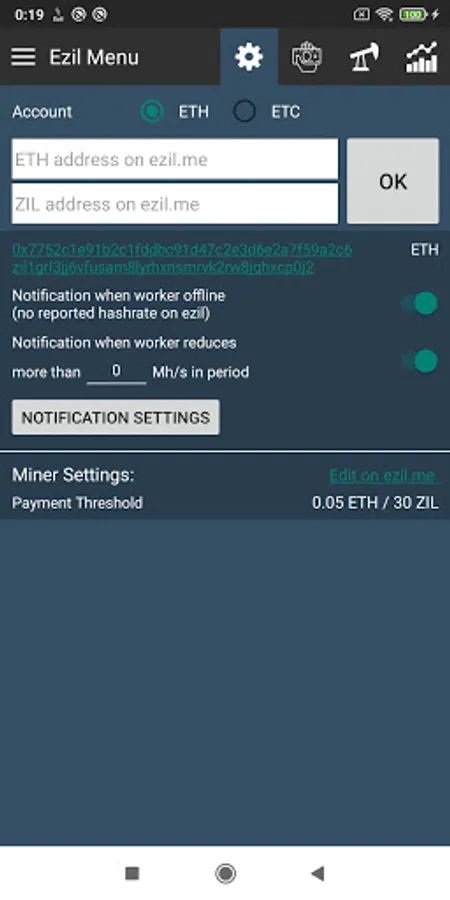 Ezil Monitor & Notification is 3rd application for checking status on Ezil (Ezil.me). Check your current Hashrate, Balance, Workers, Next payouts, Chart,...