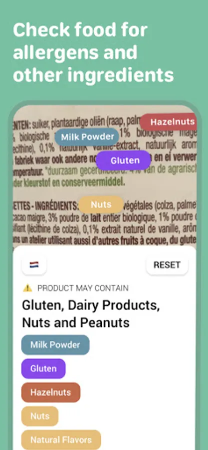 Soosee helps you quickly scan ingredient lists for words you want to avoid. It includes more than 30 categories for common allergies, a vegan lifestyle, pregnant women, high environmental impact, additives, health and more! Point your camera at an ingredient list and words you have enabled are highlighted instantly.