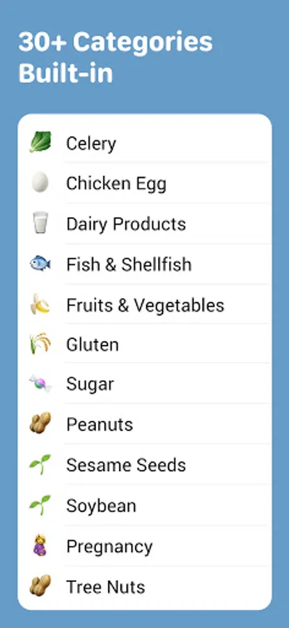 Celery, Chicken Egg, Dairy Products, Fish and Shellfish, Fruit & Vegetables, Gluten, Lupine, Peanut, Sesame Seed, Soybean, Spices & Herbs, Sulfite, Tree Nuts, Animal Derived E-Numbers, General Non-Vegan, Meat, Microplastics, Palm Oil, Sugar, Pregnancy and Additives.