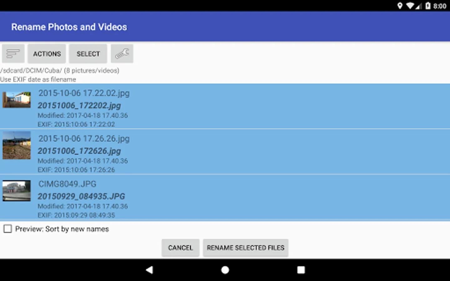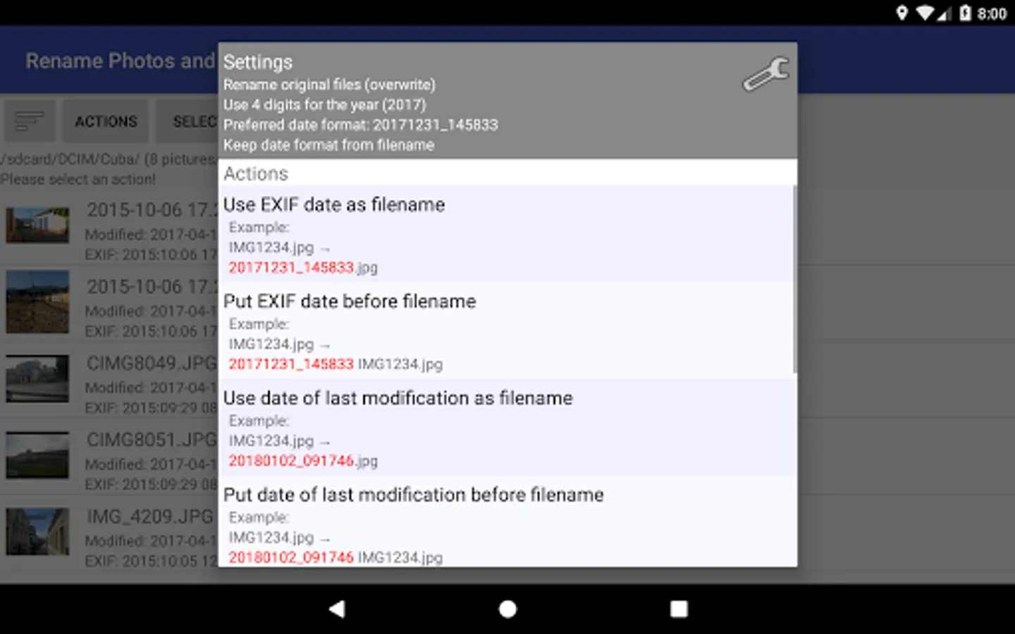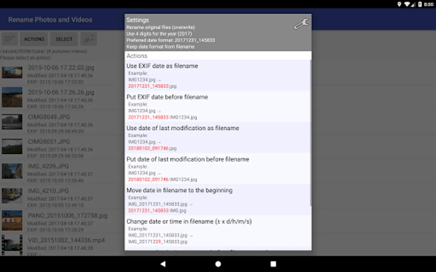 For these reasons, it makes good sense to rename your photos and videos with this app before transferring them to another device (smartphone, tablet or PC), so that all filenames begin with the date taken.