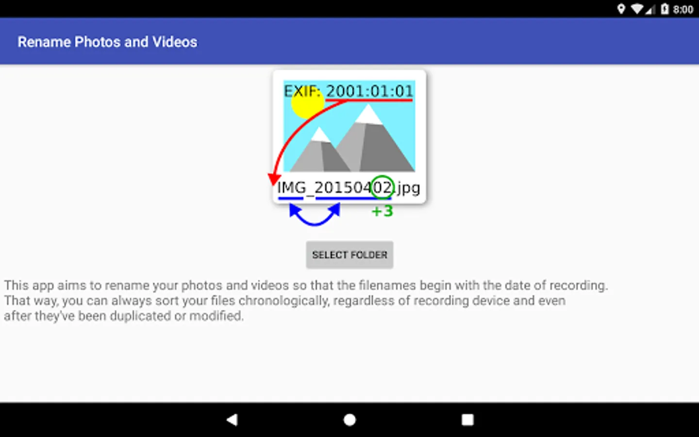 This app aims to rename your photos and videos so that the filenames begin with the date of recording. That way, you can always sort your files chronologically, regardless of recording device and even after they've been duplicated or modified.