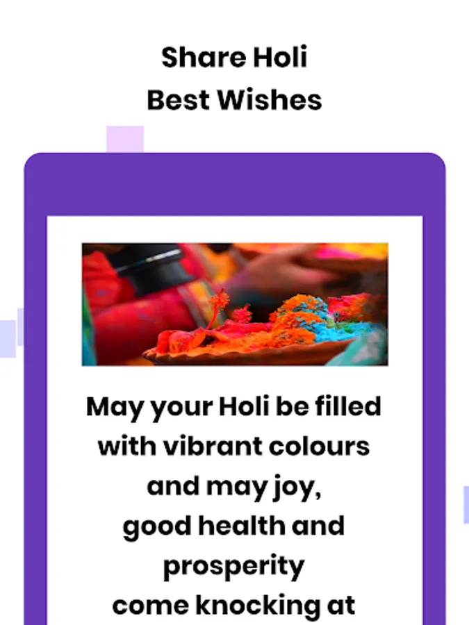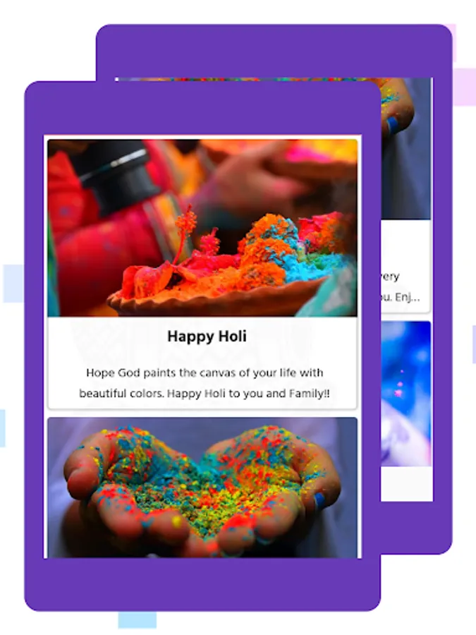 Holi is the most colourful festival across the world everyone love this festival celebrate with friends kids to aged everyone feel free and enjoy, the festival makes more amazing with food and wishes with this amazing App you can create a wishes cards and you can also set beautiful wallpaper with this app and you can share them too.