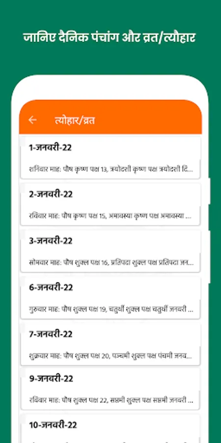 हिन्दू पंचांग कैलेंडर 2022 में उपवास और भारतीय त्योहारों के सक्षेप में विवरण हैं। इस कैलेंडर में सभी महत्वपूर्ण व्रत और पंचांग सटीक विवरण के साथ दिए गए हैं, साथ ही इसमें सभी त्योहारों की एक सूची बनाई है जिसमें आप सिर्फ त्योहारों व व्रत के दिन को देख सकते है इस ऐप को सामान्य कैलेंडर ऐप से अलग रूप देकर इसे और भी सरल बनाया गया है।