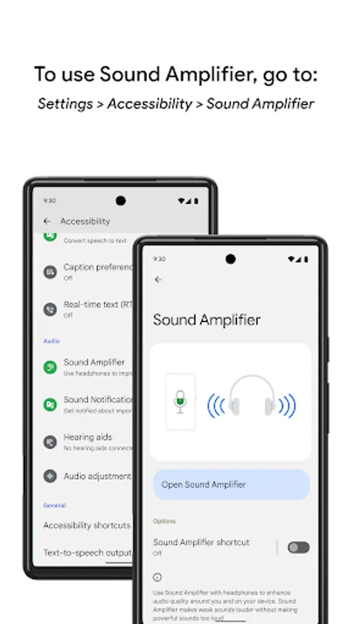 Available for devices with Android 8.1 and later. To start using Sound Amplifier, connect your headphones then go to Settings > Accessibility > Sound Amplifier or Settings > Accessibility > Downloaded apps.