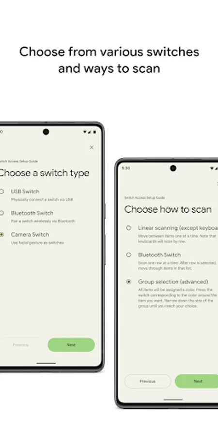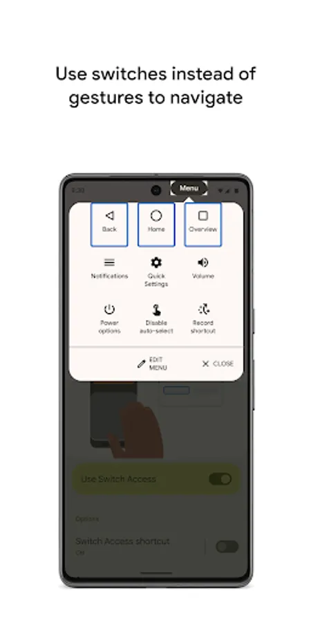 Control your phone or tablet using switches or the front camera. You can use switches to select items, scroll, enter text, and more.