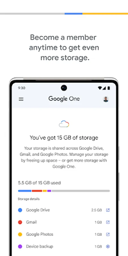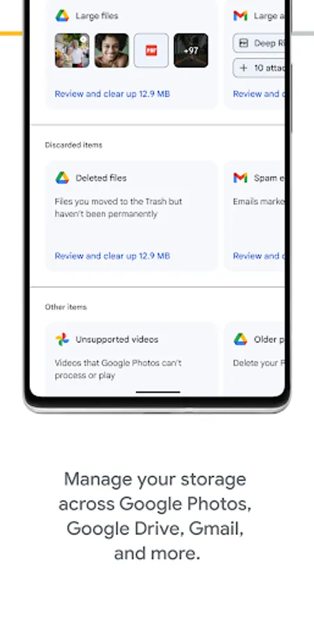 • Manage your existing Google Account storage across Google Drive, Gmail, and Google Photos.