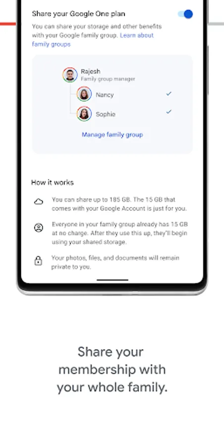 • Share your storage and benefits with up to 5 additional people. Each person will have access to more storage from your plan but not access to each other’s files.