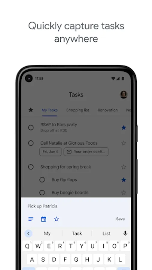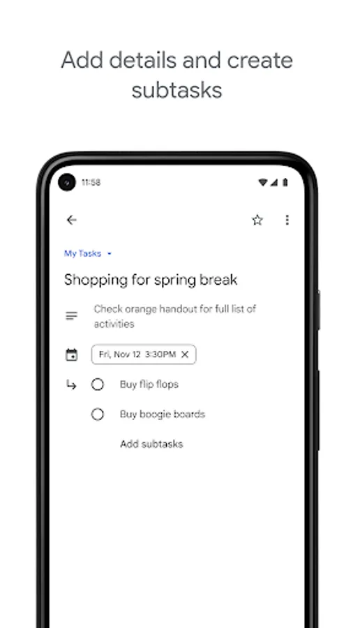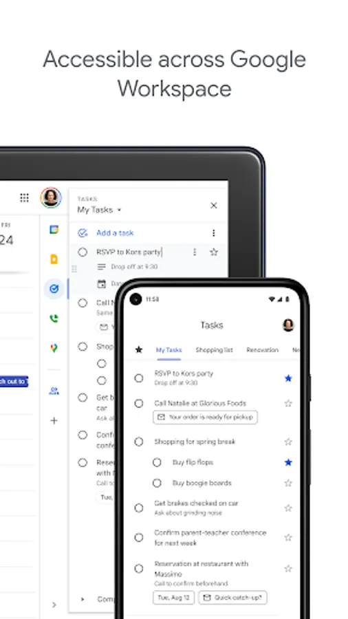 Get more done with the Google Tasks mobile app. Manage, capture, and edit your tasks from anywhere, at anytime, with to-dos that sync across all your devices. Integrations with Gmail and Google Calendar help you get tasks done—faster.