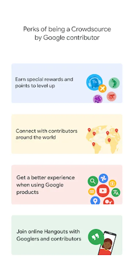 Each time you submit an answer, you make Google products more inclusive for years to come. You'll also be rewarded for your help with perks, such as connecting with other contributors at local meetups, receiving exclusive invites to online Hangouts with Googlers and other contributors, and getting featured on Crowdsource's social channels. Whether you're on the train, at a bus stop or waiting in a queue, take some time to make Google better for your local community.