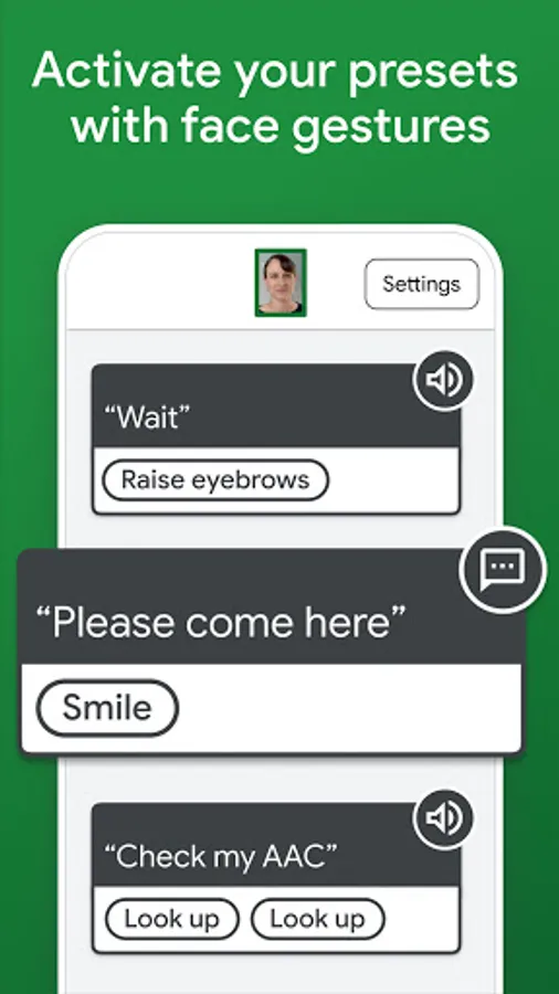 Text a loved one, get a caregiver's attention, or laugh along with friends. Project Activate is designed for people who are unable to speak or use technology with their hands, including those who have ALS, muscular dystrophy, cerebral palsy, or multiple sclerosis, and those who have had a brainstem stroke or cervical spinal cord injury. This app enables you to activate customized preset communications by making facial gestures, such as smiling or looking up.