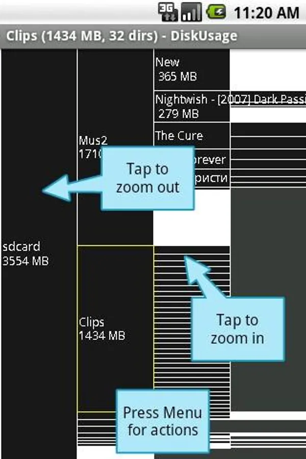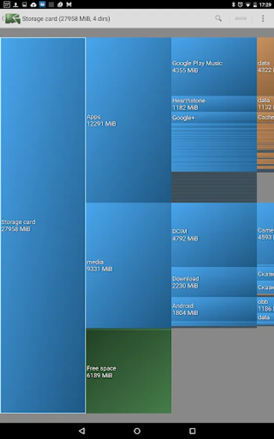 DiskUsage provides a way to find files and directories on storage card which consume a lot of space. Displays diagram with directories/subdirectories proportional to their size.