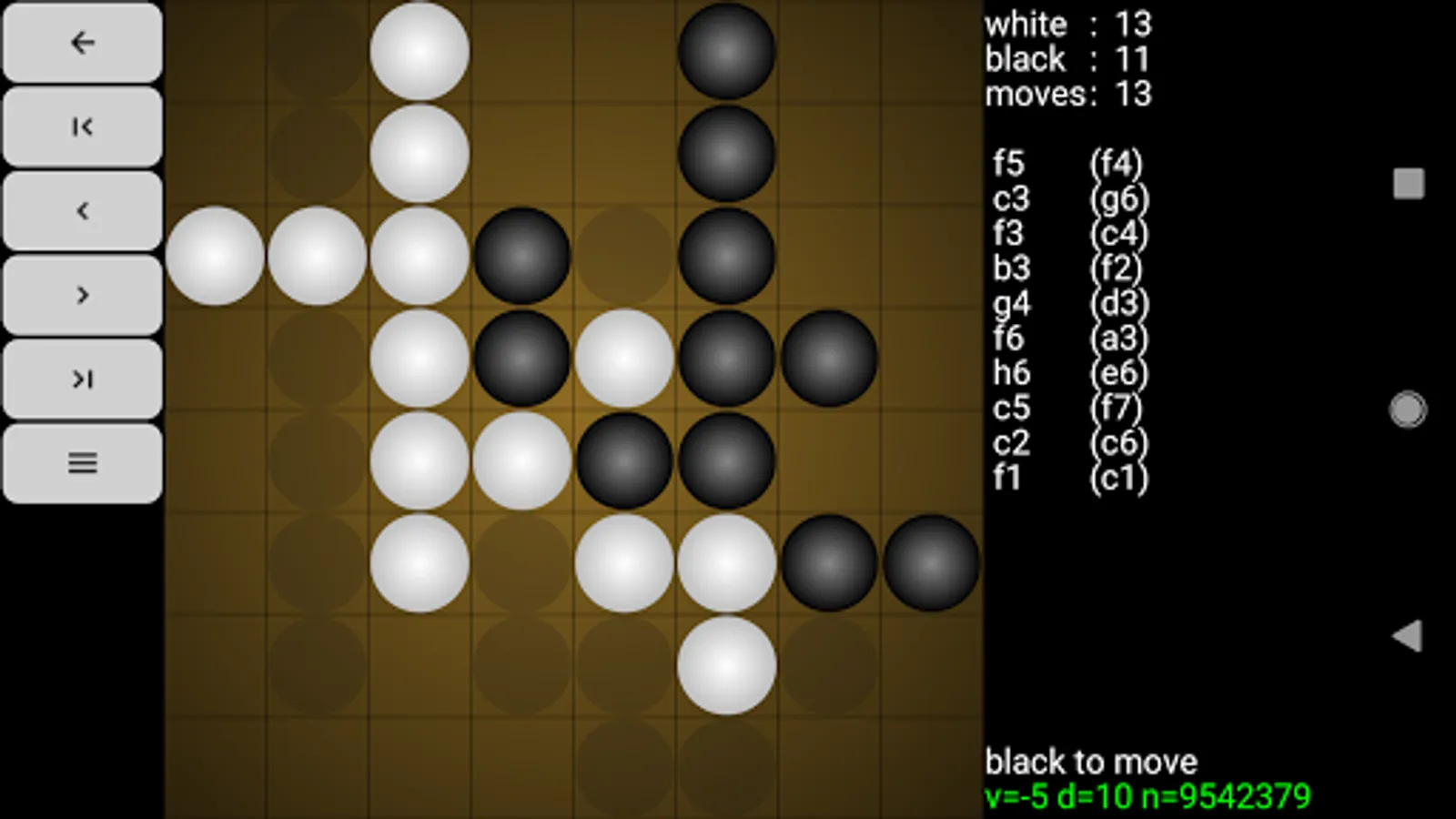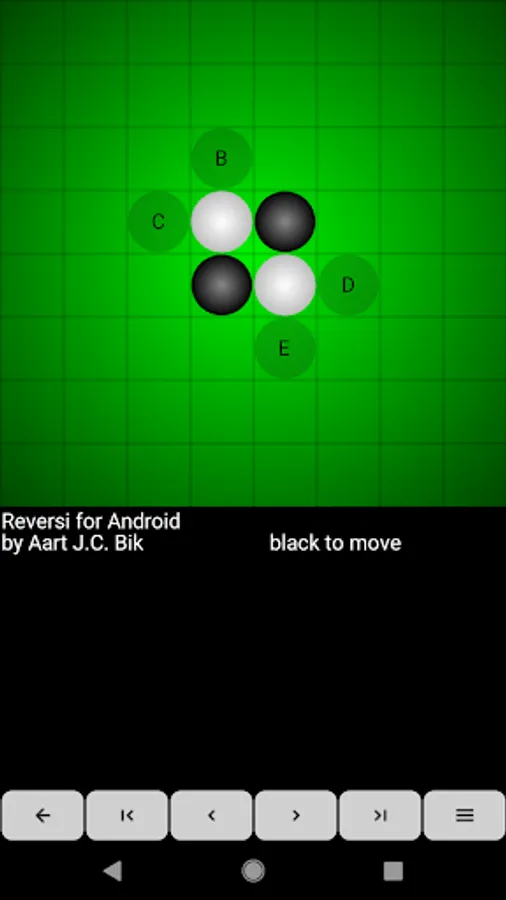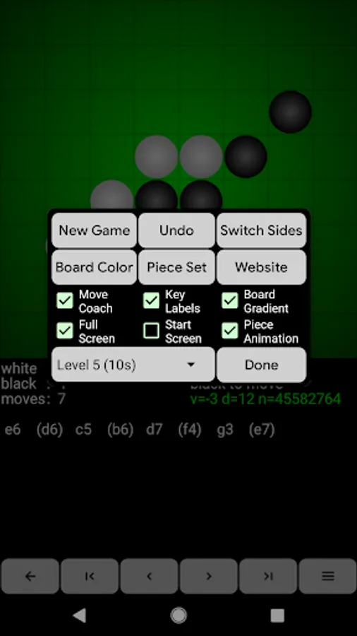 Reversi for Android consists of a reversi engine and a GUI. The application accepts moves through the touch screen, the trackball, or through the keyboard. An optional "move coach" shows all valid moves as ghost stones and animation highlights the new and flipped stones after each engine move. Full game navigation enables users to correct mistakes or analyze games. Games export to the clipboard or via sharing. The engine plays at various levels (including random and free-play). The user can play either side.