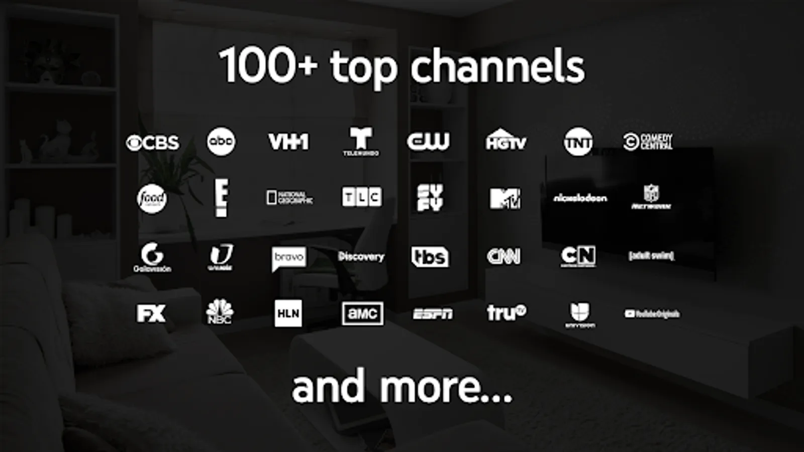 AMC, Animal Planet, BBC America, BET, Bravo, Cheddar, CMT, Comedy Central, Comet, Cozi TV, Decades, Discovery, E!, Food Network, Freeform, FX, FXM, FXX, Galavisión, IFC, Investigation Discovery, HGTV, MotorTrend, MTV, Nat Geo, Nat Geo Wild, Oxygen, Paramount Network, Pop, Smithsonian Channel, SundanceTV, SyFy, TBS, TCM, TLC, TNT, Travel Channel, TruTV, TV Land, Univision, UniMás, USA, VH1, WE tv, YouTube Originals, and more
