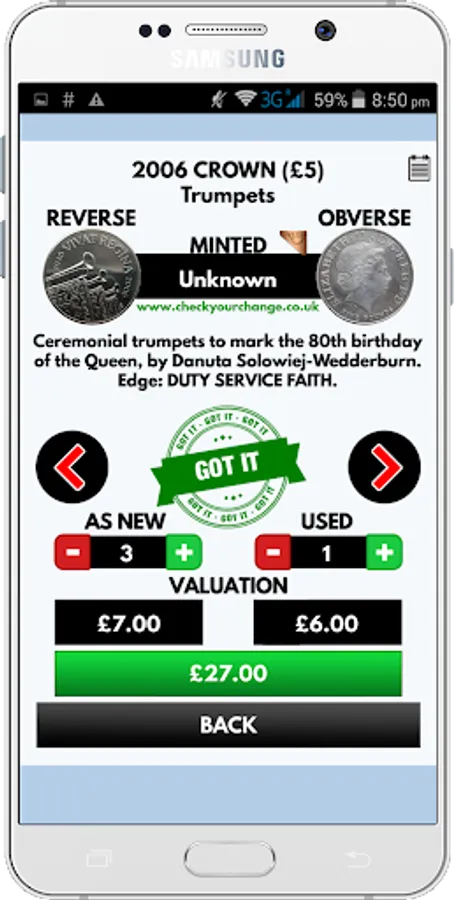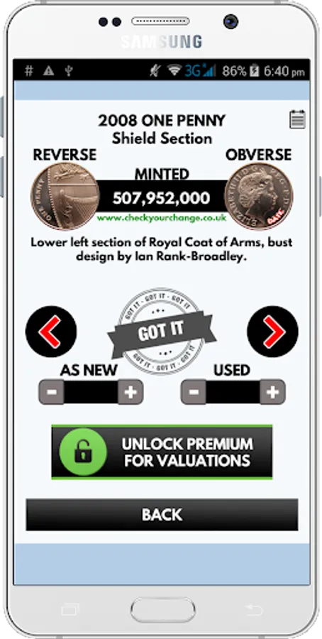 The Check You Change App is the most feature packed app for UK coinage collectors. It allows you to view all information for current circulating UK mainland coins*. As standard you can toggle coins as 'got' or needed and use the colour-coded view to easily show what coins you need and which you already have. Features: