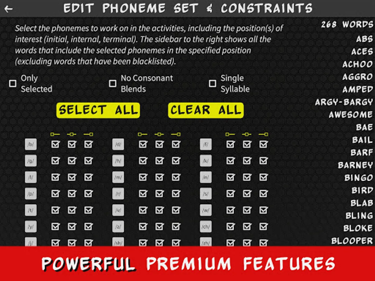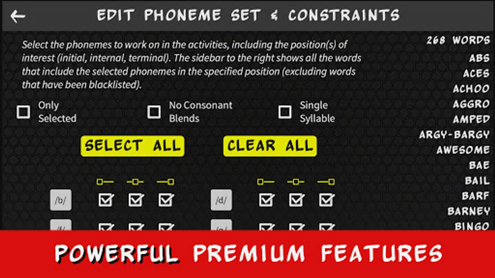 With the Editor feature, you can fine tune which phonemes the learner is asked to identify and differentiate. Want to train on phonemic awareness of word-initial consonants only? Short vowel sounds? Exclude consonant blends? Use single-syllable words only? It's all easy with the Editor. Educators will agree that this premium feature is a must for phonemic awareness training.
