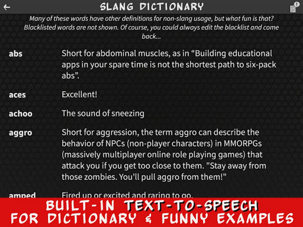 With over 250 slang words from all over the globe, there are sure to be some words or usages that are new to your older student or even you. No worries! A tongue-in-cheek slang dictionary is built into the app with a handy text-to-speech function to read the definitions aloud.