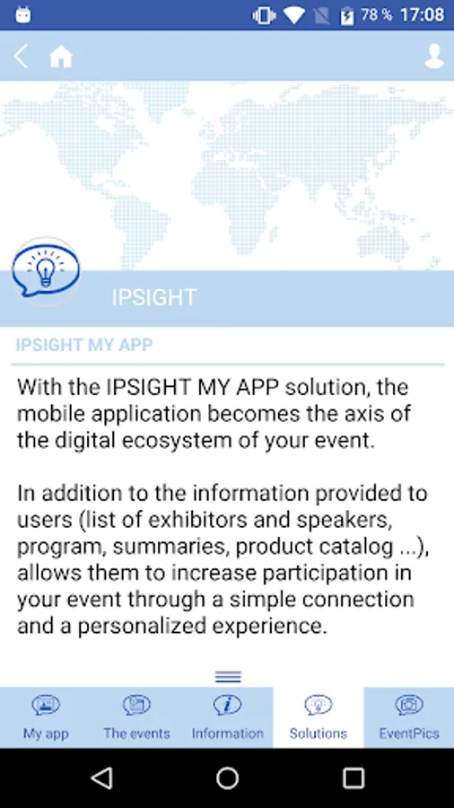 IPSIGHT's My App is a platform that creates applications for mobile events (B2B and B2C fairs, congresses and corporate events) that offers participants interactive content, networking and participation.