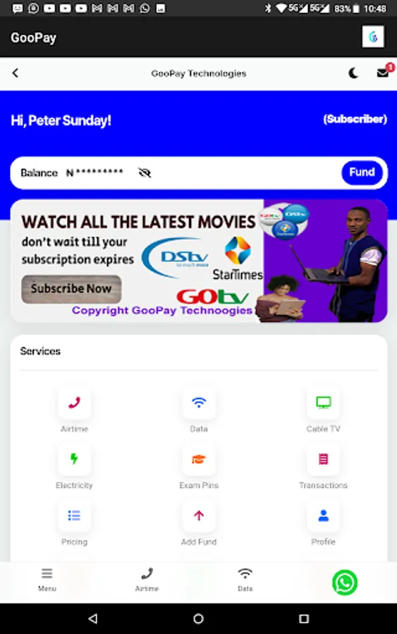 Goopay offer instant recharge of Airtime, Databundle, CableTV (DStv, GOtv & Startimes), Electricity Bill Payemnt and so much more.